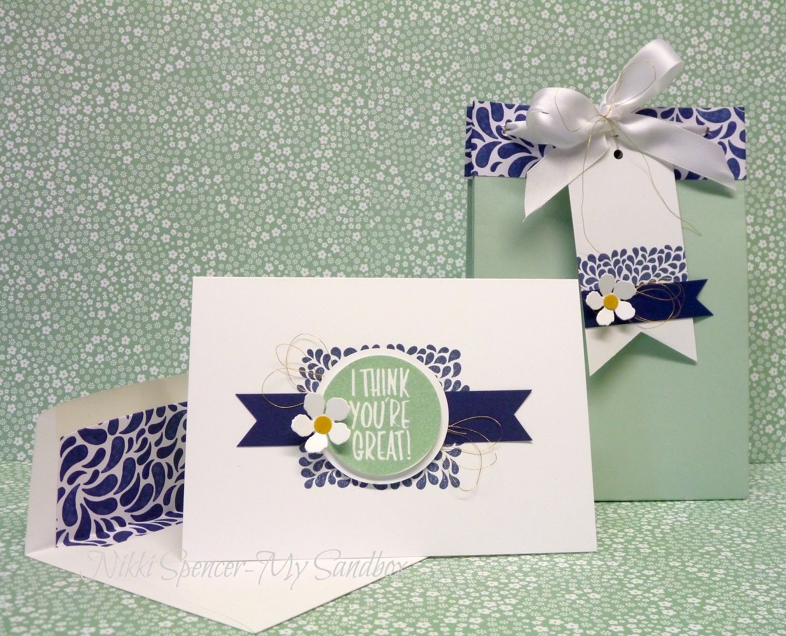 1. The navy and mint combination is beautiful! I love the tag and the front panel on the card. Someone will love this gift duo!