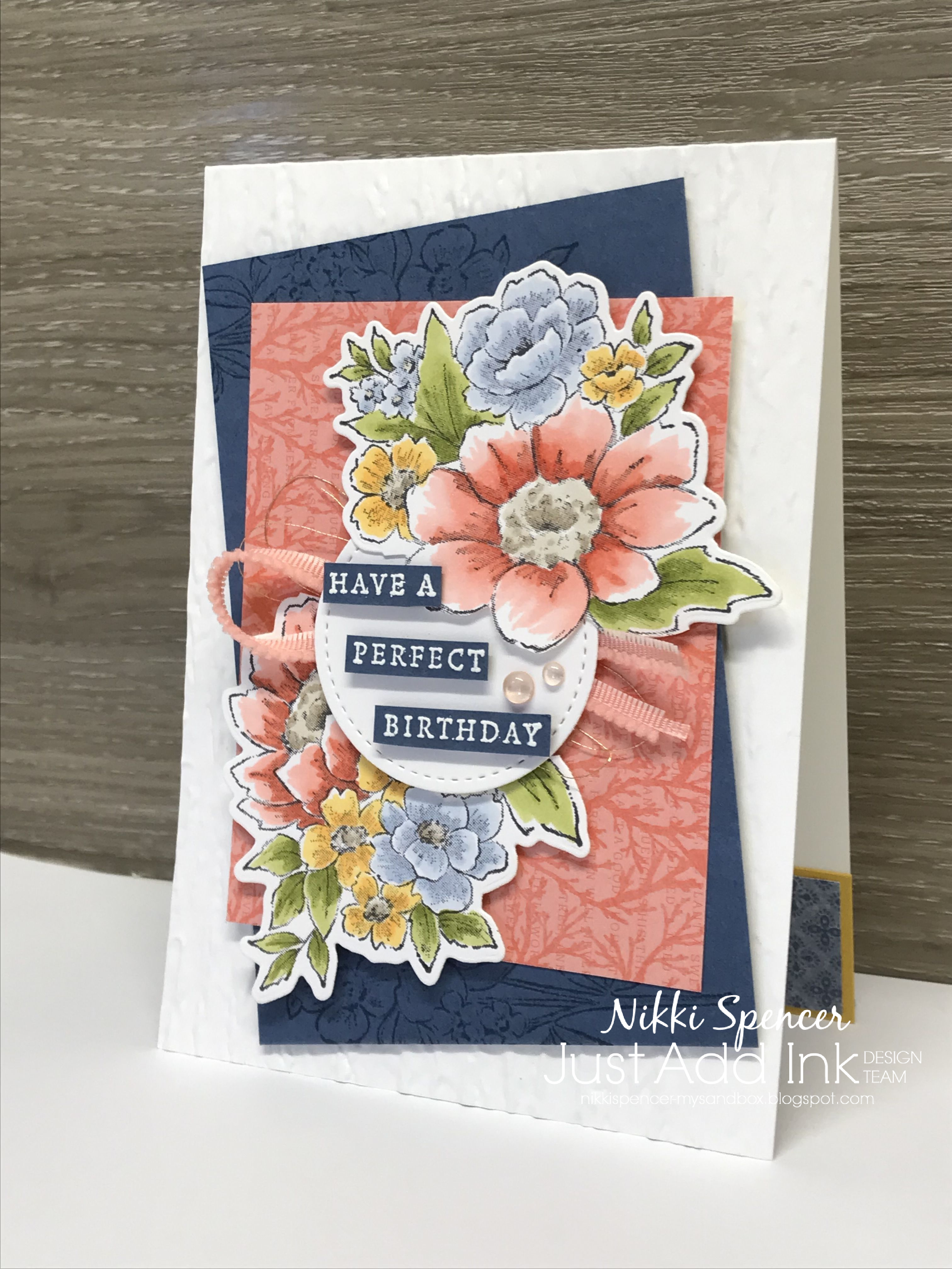 The colours are such a pretty combination and were dictated by the gorgeous Harvest Meadow dsp and they are Mist Moonlight-Calypso Coral/Cajun Craze-Bumblebee/Mango Melody-Blushing Bride-Old Olive-Mossy Meadow-Balmy Blue.